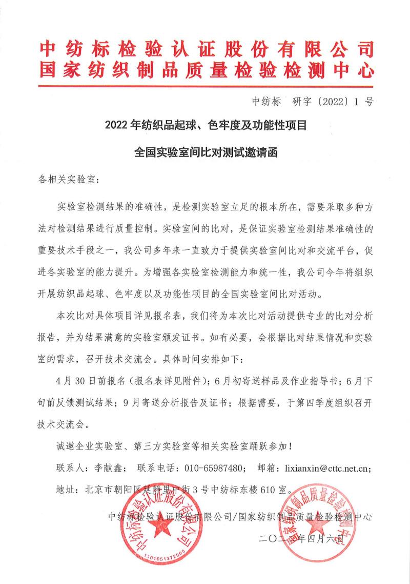 邀請函:2022年度紡織品起球、色牢度以及功能性項(xiàng)目的全國實(shí)驗(yàn)室間比對活動(dòng)邀請函