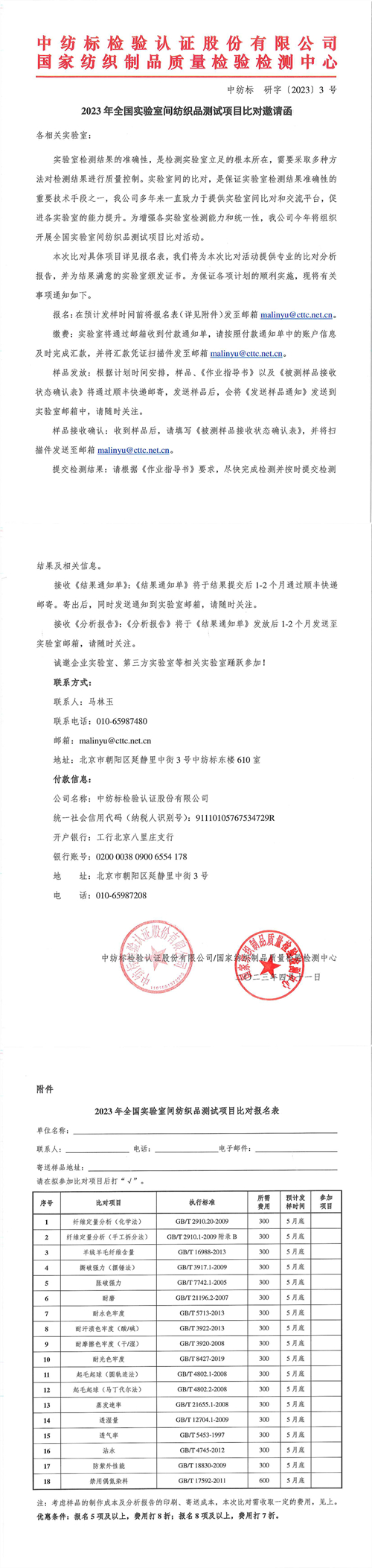 2023年全國實驗室間紡織品測試項目比對邀請函