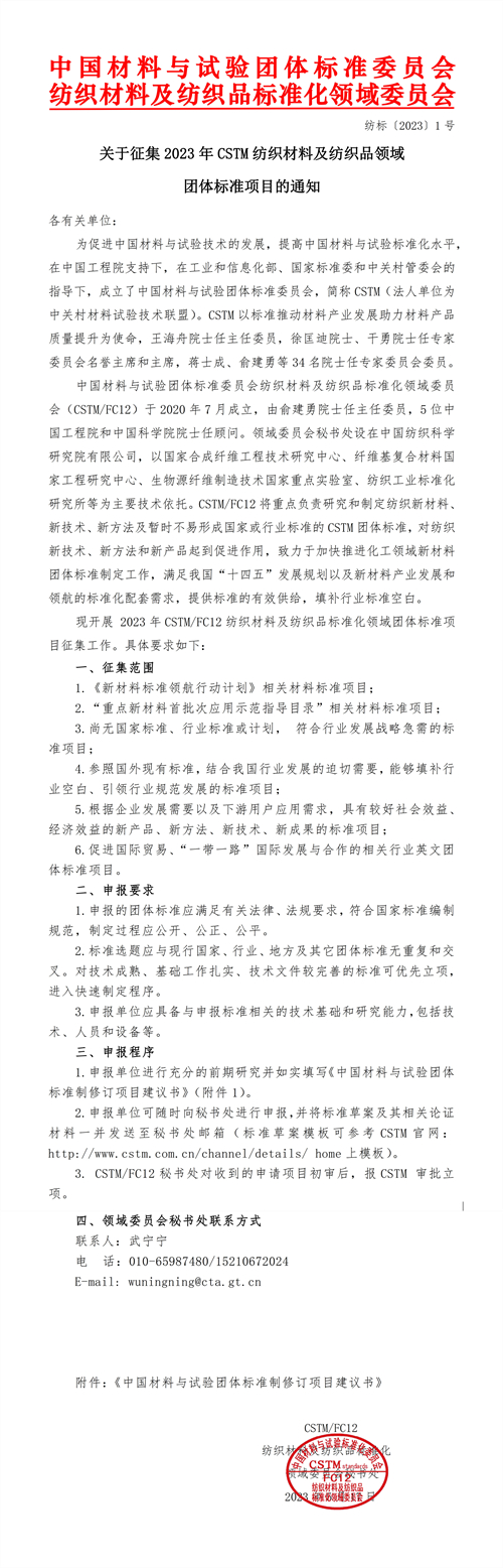 附件:關(guān)于征集2023年CSTM紡織材料及紡織品領(lǐng)域團體標準項目的通知